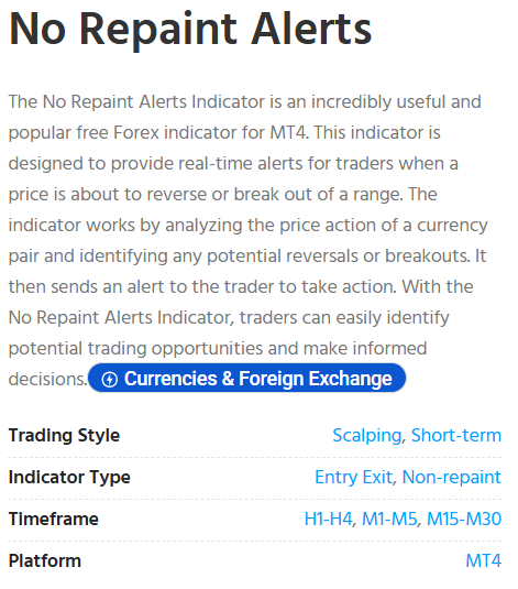 The No Repaint Alerts Indicator is a powerful Forex trading tool designed for the MetaTrader 4 (MT4) platform. It analyzes price action and technical indicators to provide clear buy and sell signals when the market is about to reverse or break out. The signals do not repaint, meaning once they appear on the chart, they remain fixed and reliable.