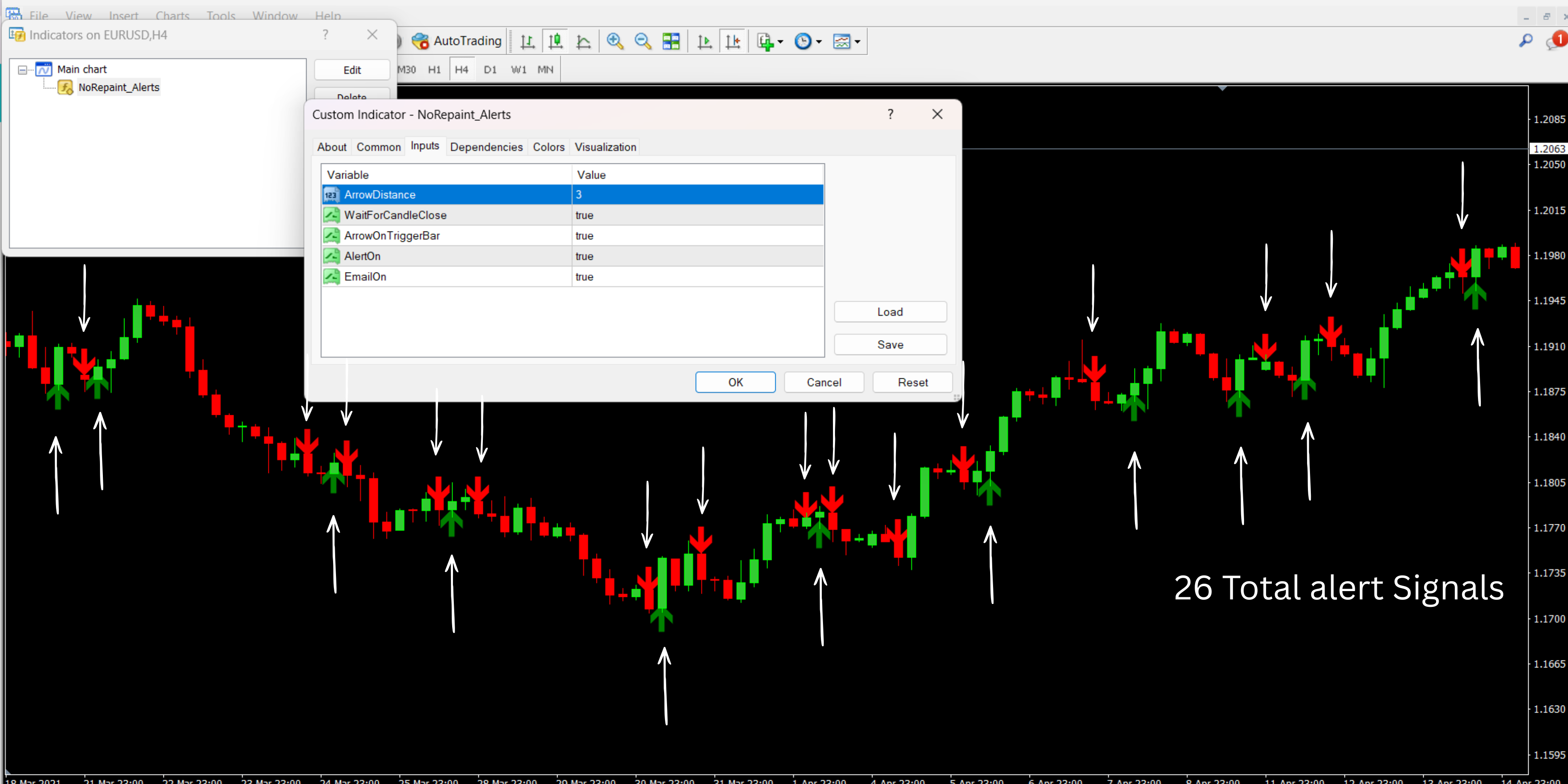 The core strength of the No Repaint Alerts Indicator lies in its ability to generate trading signals that do not repaint. This means that thegreen and red buy and sell arrows displayed on your chart are based on a combination of robust technical indicators, such as moving averages, MACD, Stochastics, and RSI, and will not change or disappear once they are plotted.